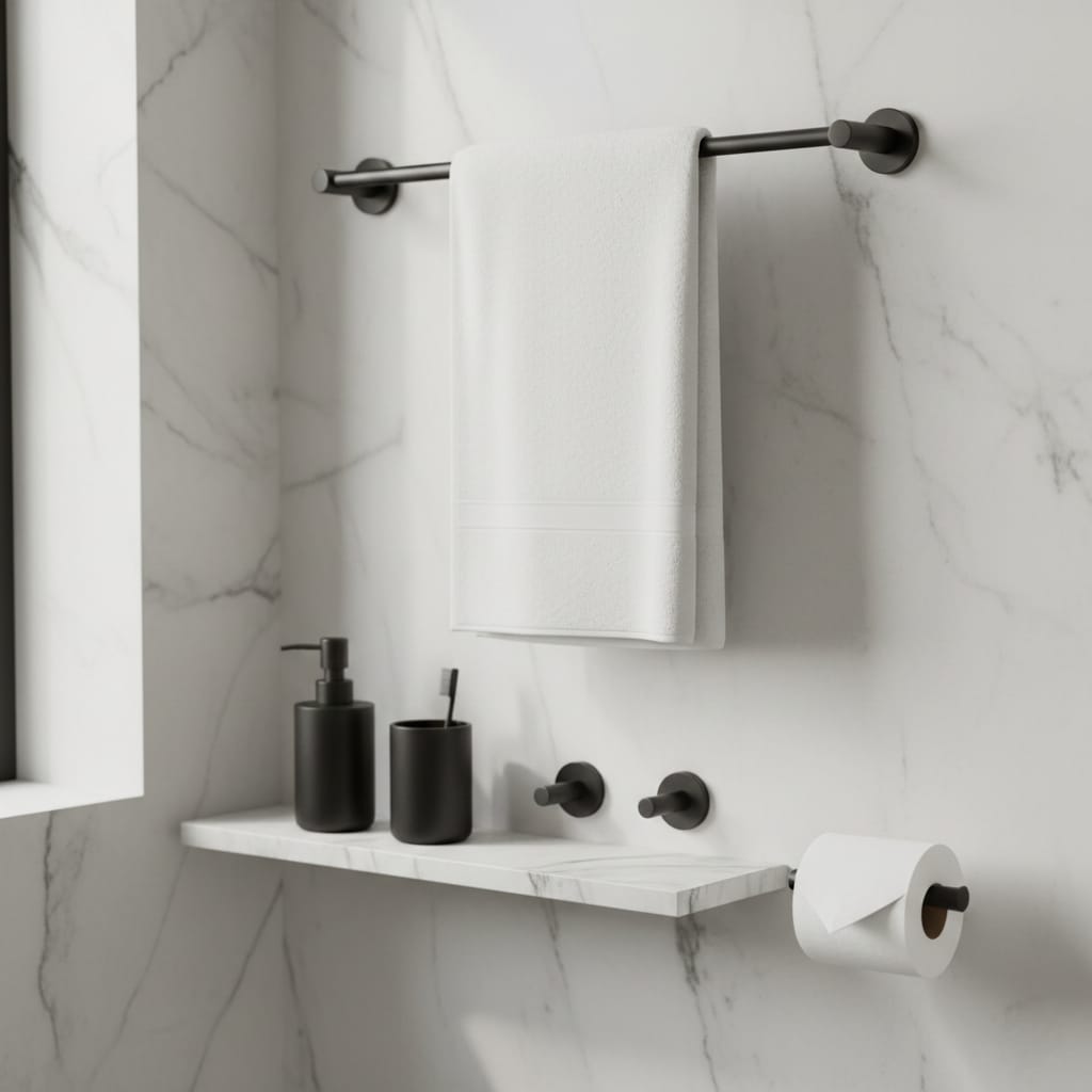 طقم أكسسورات 6 قطع خزف (رف / صبانة بانيو / صبانة حوض / وراقة / علاقة مزدوجة / فواطة) من ساني بيور