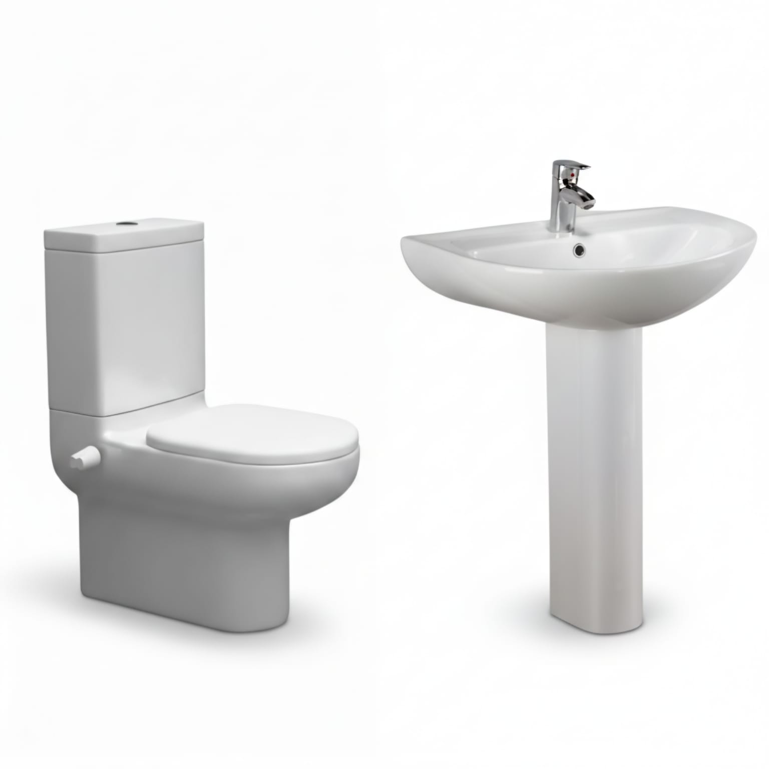 يتكون من مرحاض – قاعدة (تواليت) وحوض 65 سم بالعامود الطويل