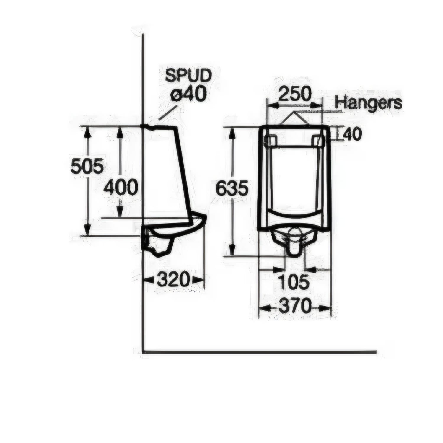 الأبعاد: الارتفاع 635 مم، العرض 370 مم، والبروز (العمق) 320 مم.