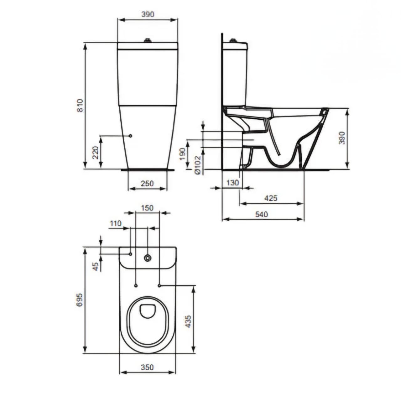 الأبعاد: الأبعاد التقريبية للمرحاض الكامل (مع الخزان) هي 35 سم × 68 سم.
